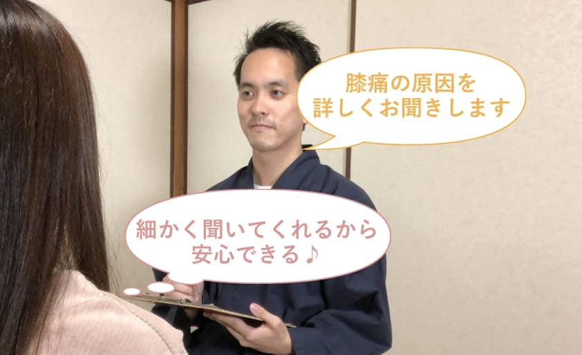 まずはあなたの状態を把握するために、「膝痛」に特化したカウンセリング票に記入して頂きます。その後は「どこが、どのように、いつ頃から、何をしていて痛むのか」など膝痛の原因を突き止めるうえで重要な情報を詳しくお聞きしていきます。